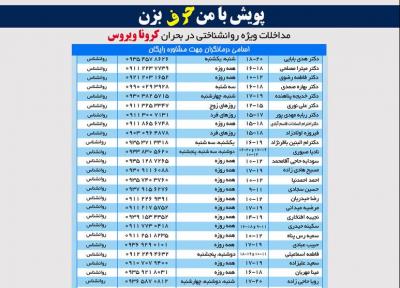 42 روانشناس و روانپزشک مازندرانی به منظور کنترل آثار روانی ویروس کرونا با ارائه شماره تلفن همراه خود مشاوره رایگان می دهند.